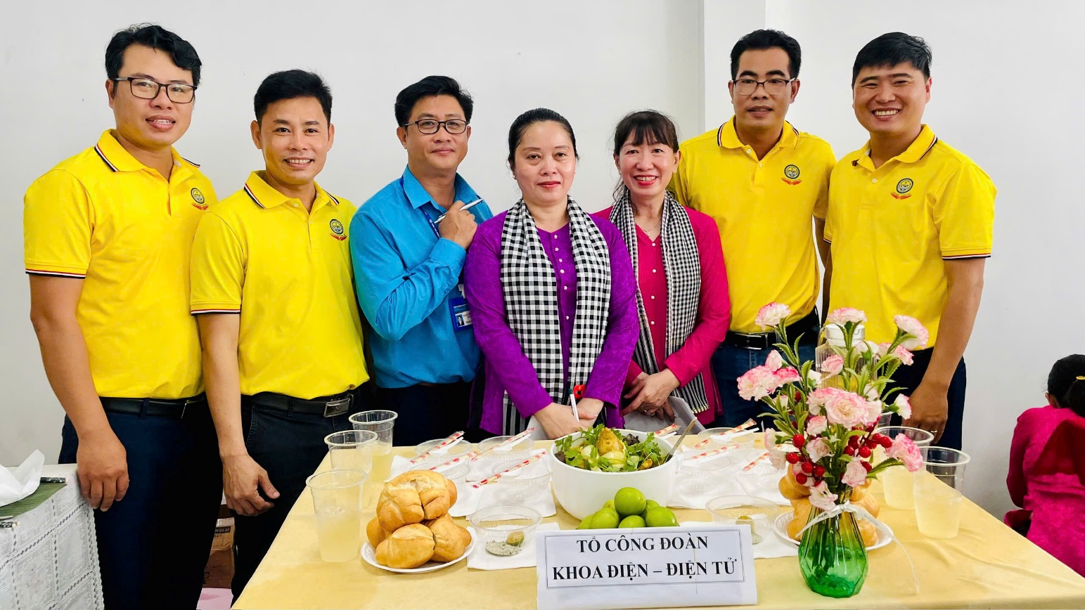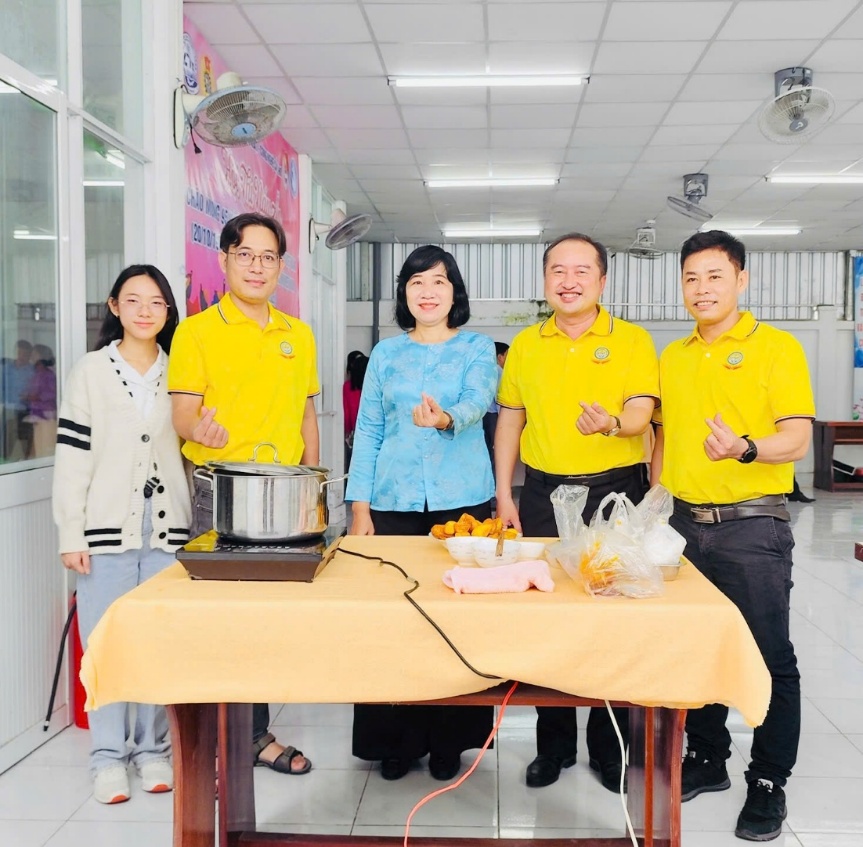 Ban Giám hiệu và CĐCS chụp ảnh lưu niệm cùng Giảng viên Chandra (Ấn Độ) và Trợ giảng tiếng Anh Isaac (Mỹ) dự thi món Cà ri Ấn Độ