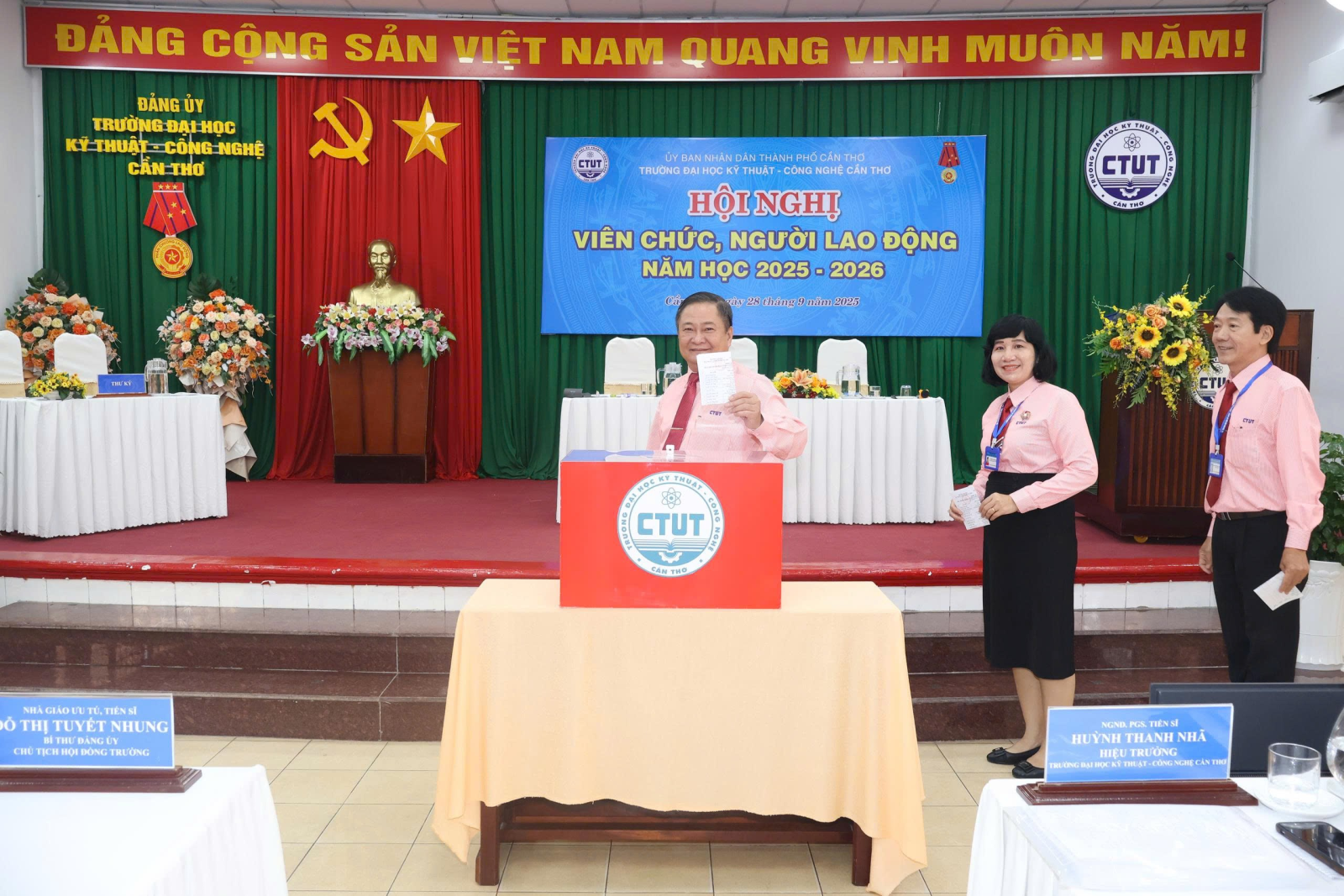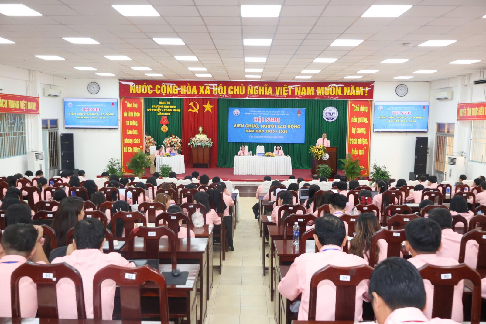 Ngày 28/9/2025, Trường Đại học Kỹ thuật - Công nghệ Cần Thơ đã long trọng tổ chức Hội nghị viên chức, người lao động năm học 2025 - 2026. Đây là sự kiện chính trị quan trọng, thể hiện tinh thần dân chủ, đoàn kết và quyết tâm của toàn thể viên chức, giảng viên, nhân viên Nhà trường trong việc thực hiện thắng lợi nhiệm vụ năm học mới.