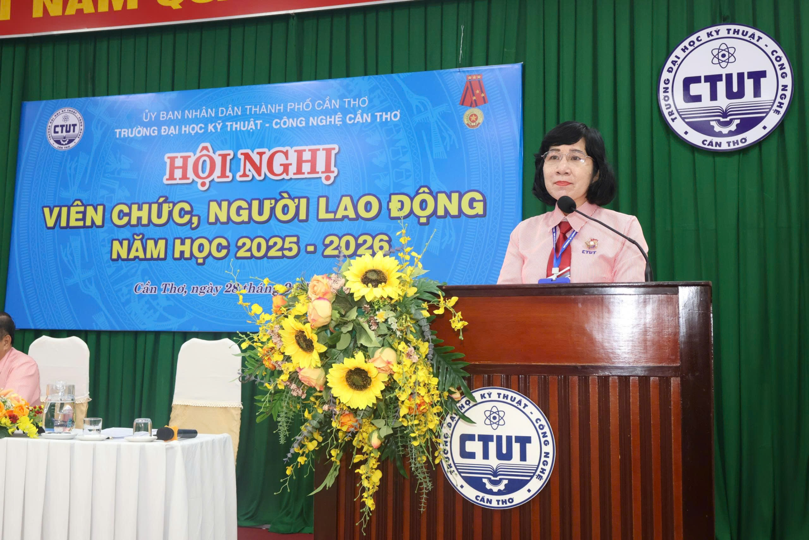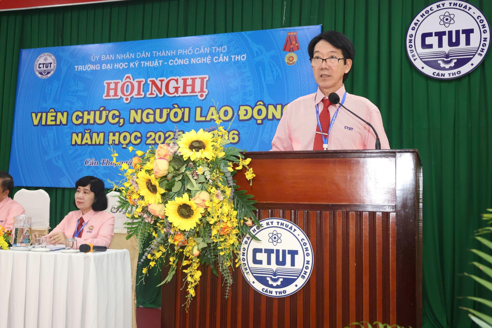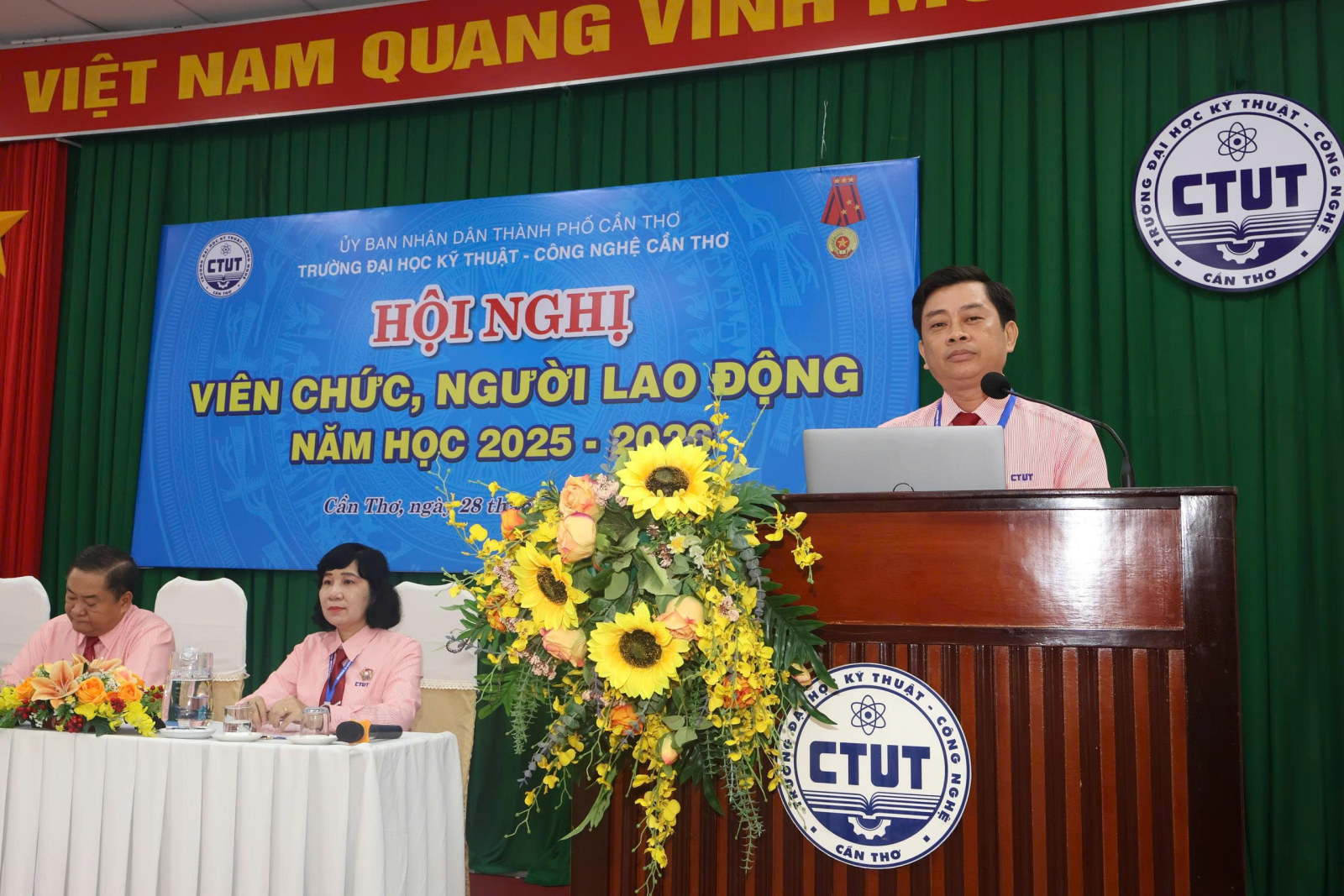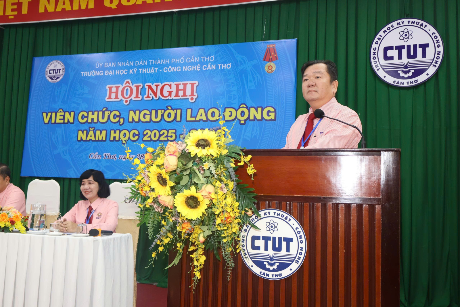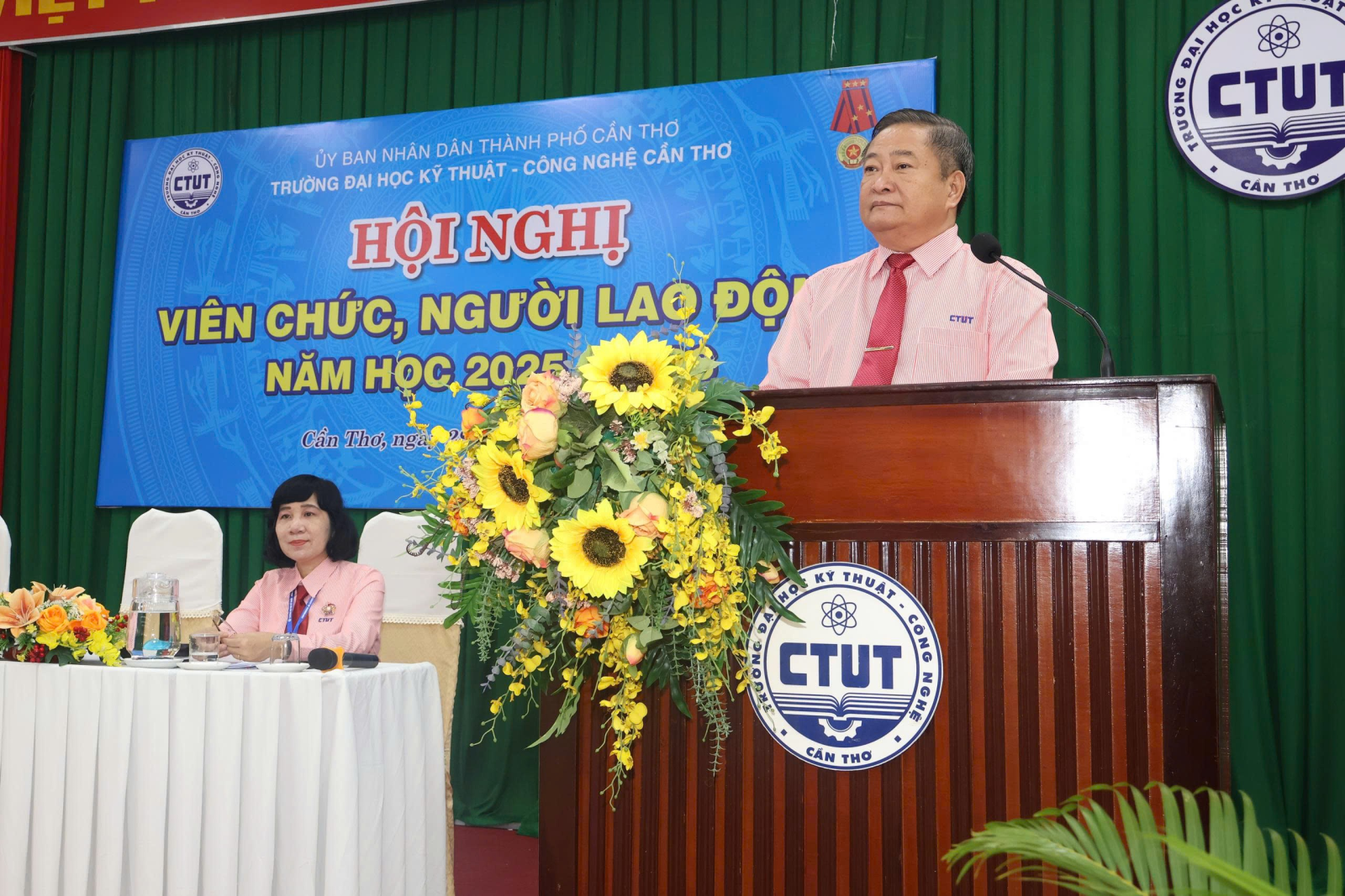 Phát biểu tại hội nghị, NGND. PGS. TS Huỳnh Thanh Nhã, Hiệu trưởng Trường Đại học Kỹ thuật - Công nghệ Cần Thơ ghi nhận những đóng góp của toàn thể viên chức, người lao động vào thành công của Trường trong năm học qua. Thầy khẳng định: Hội nghị VCNLĐ là dịp để tập thể Nhà trường cùng nhìn lại những kết quả đã đạt được, thẳng thắn trao đổi những tồn tại, khó khăn, đồng thời đề ra giải pháp và cam kết hành động cho năm học mới. Với tinh thần đoàn kết, trách nhiệm, kỷ cương, sáng tạo, chắc chắn Nhà trường sẽ hoàn thành và vượt các chỉ tiêu đã đề ra.