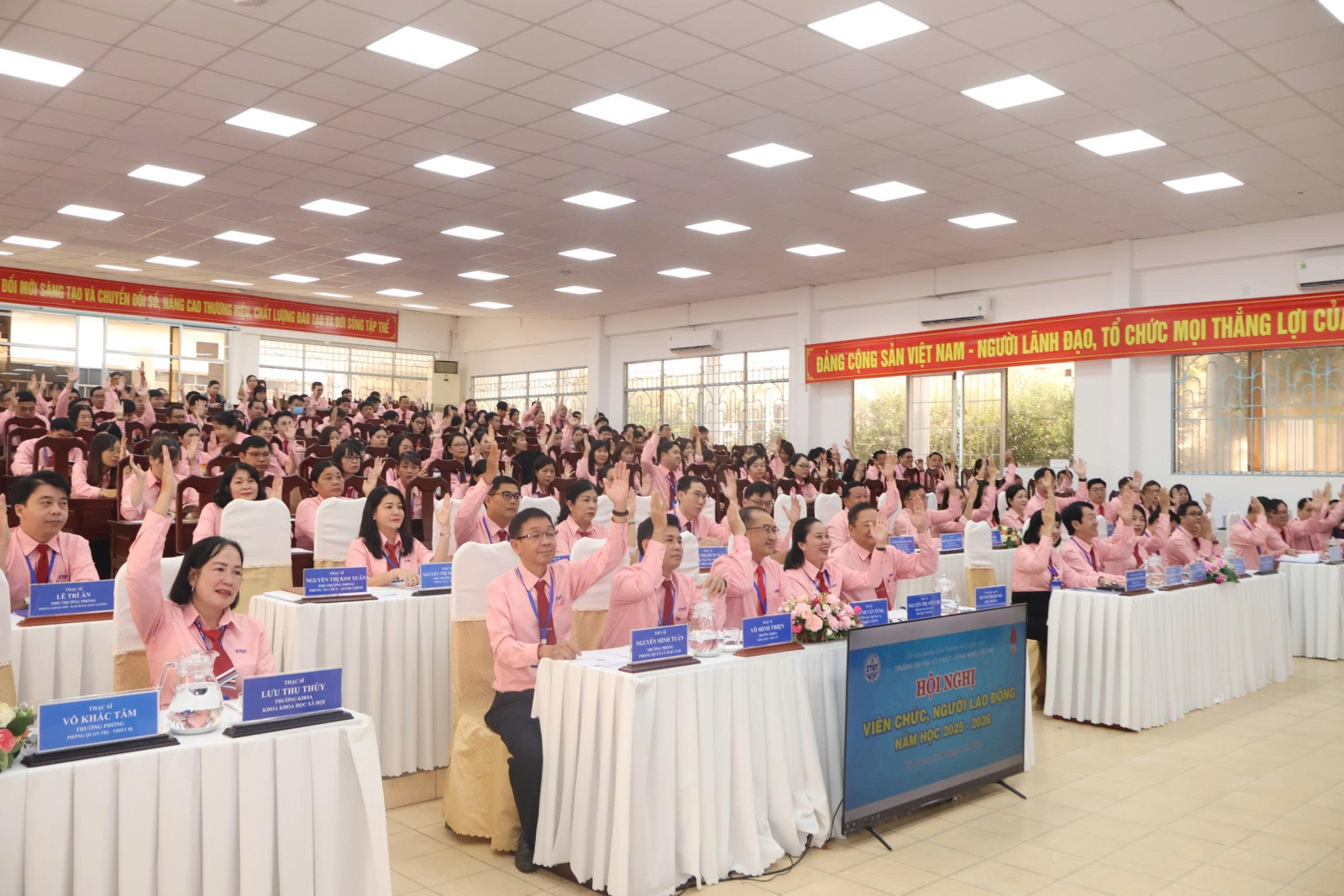Hội nghị đã thống nhất thông qua Nghị quyết VCNLĐ năm học 2025 - 2026, với nhiều mục tiêu quan trọng: nâng cao chất lượng giáo dục toàn diện; hoàn thành chỉ tiêu tuyển sinh năm 2026; đẩy mạnh tự đánh giá và kiểm định các chương trình đào tạo; thúc đẩy nghiên cứu khoa học, ứng dụng công nghệ mới, hợp tác quốc tế; xây dựng môi trường giáo dục văn minh, hiện đại; và tiếp tục phát huy truyền thống đoàn kết, dân chủ, trách nhiệm trong toàn Trường.