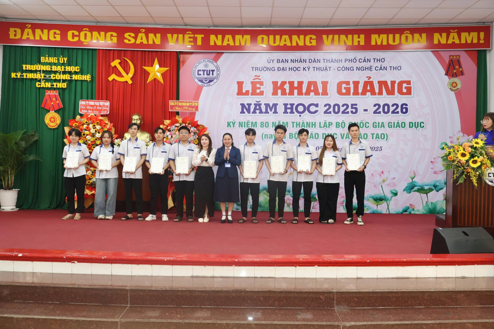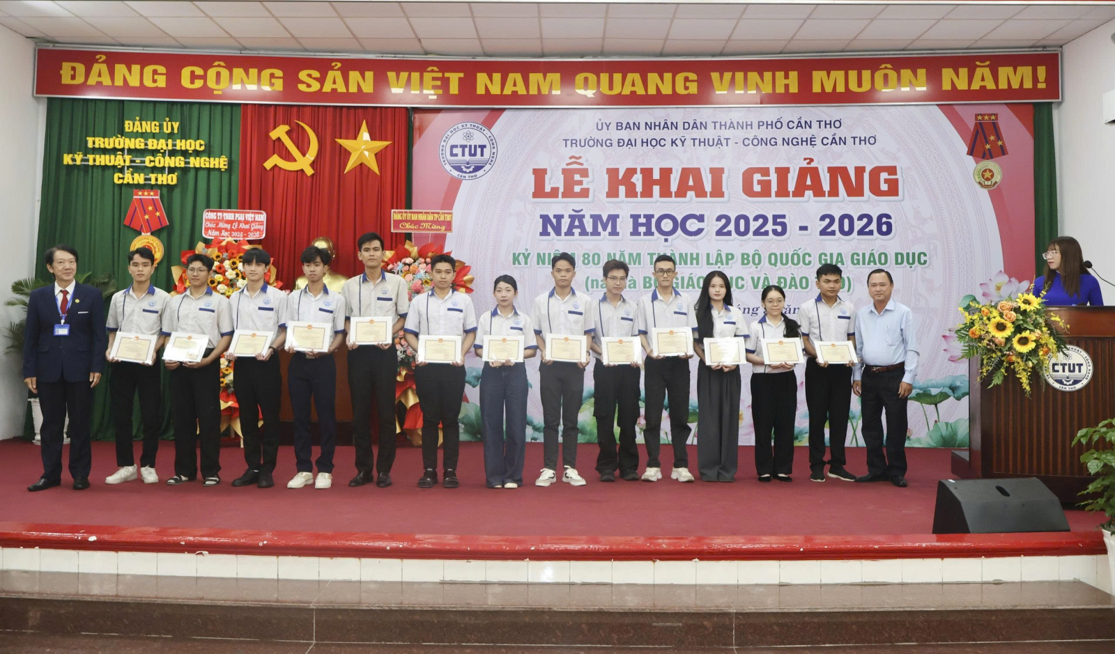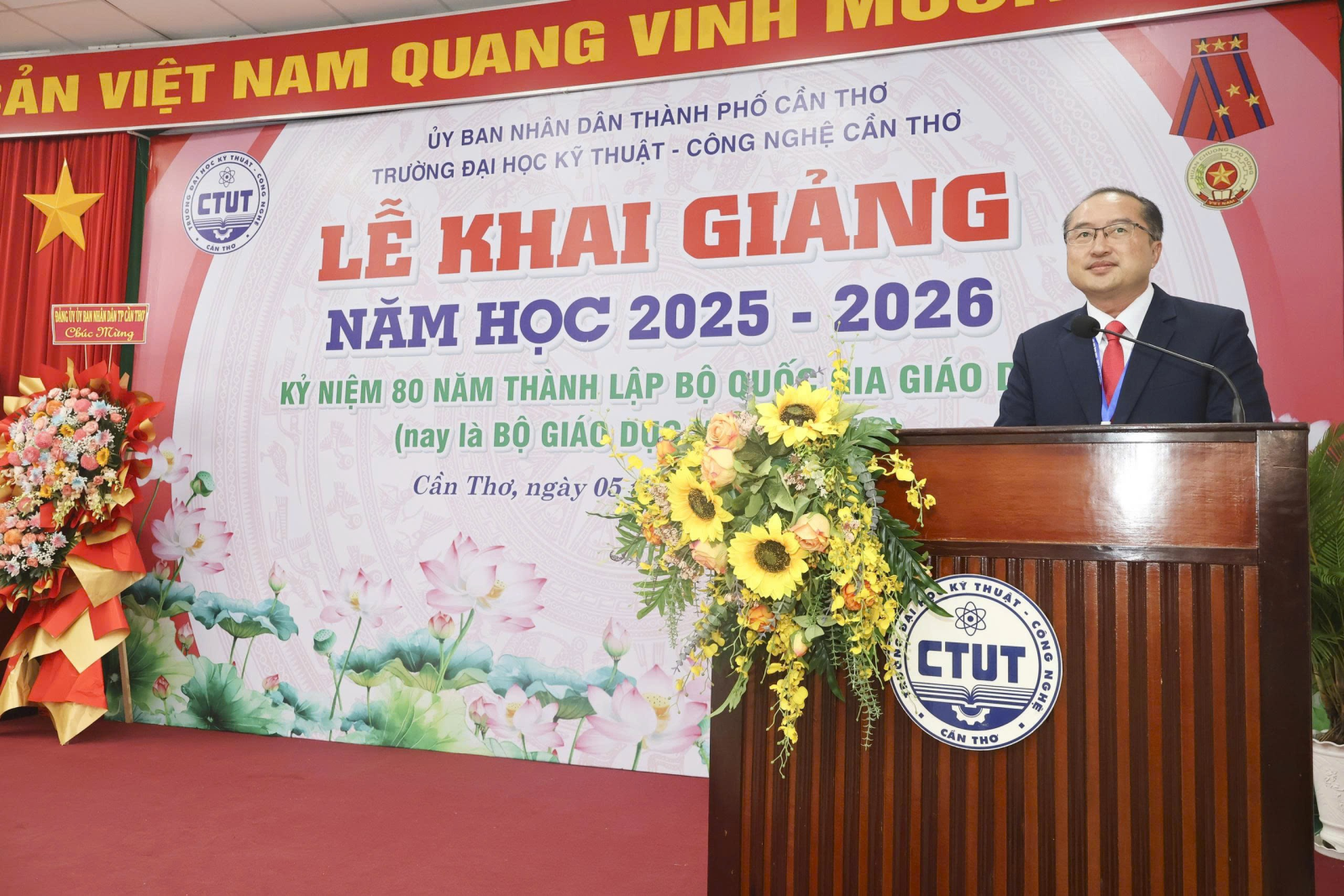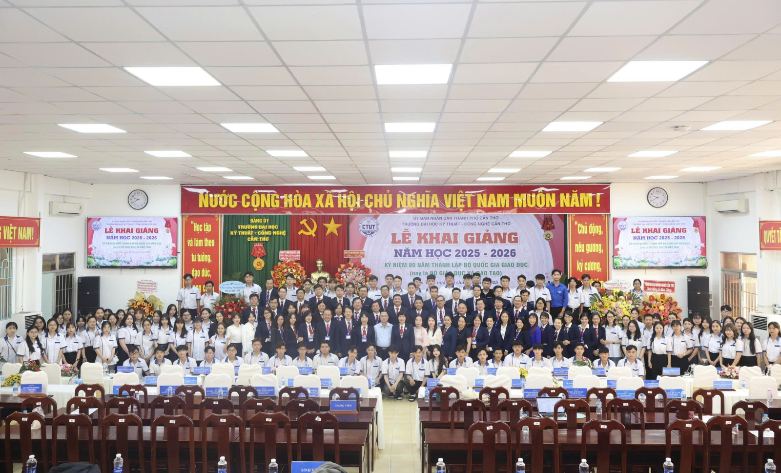 Ngày 05/9/2025, Trường Đại học Kỹ thuật - Công nghệ Cần Thơ (CTUT) long trọng tổ chức Lễ Khai giảng năm học 2025 -2026. Đây không chỉ là ngày hội truyền thống của thầy và trò, mà còn là một sự kiện có ý nghĩa đặc biệt, diễn ra đúng dịp cả nước kỷ niệm 80 năm Cách mạng Tháng Tám thành công và Quốc khánh 2/9, đồng thời kỷ niệm 80 năm thành lập Bộ Quốc gia giáo dục - nay là Bộ Giáo dục và Đào tạo.