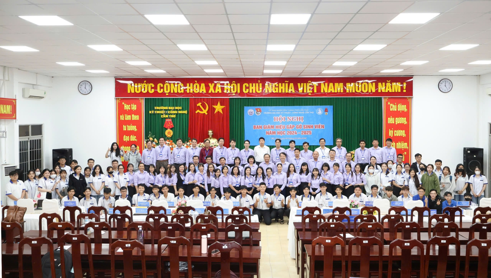 Năm học 2024 - 2025 khép lại trong bối cảnh còn nhiều khó khăn, thách thức, nhưng tập thể CTUT đã nỗ lực vượt bậc, hoàn thành xuất sắc nhiệm vụ giáo dục và đào tạo. Chất lượng đào tạo tiếp tục được khẳng định, các chương trình giảng dạy không ngừng đổi mới, gắn kết chặt chẽ với nhu cầu thực tiễn. Nghiên cứu khoa học của giảng viên và sinh viên ngày càng đi vào chiều sâu, gắn với yêu cầu phát triển của thành phố Cần Thơ và vùng Đồng bằng sông Cửu Long. Phong trào khởi nghiệp - đổi mới sáng tạo cũng có bước tiến mạnh mẽ, với nhiều giải thưởng và đề tài tiêu biểu được ghi nhận ở các cuộc thi khu vực và toàn quốc.